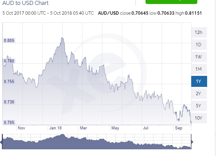Vận động của tỷ giá hối đoái giữa đô la Úc và đô la Mỹ từ tháng 10/2017 đến 10/2018