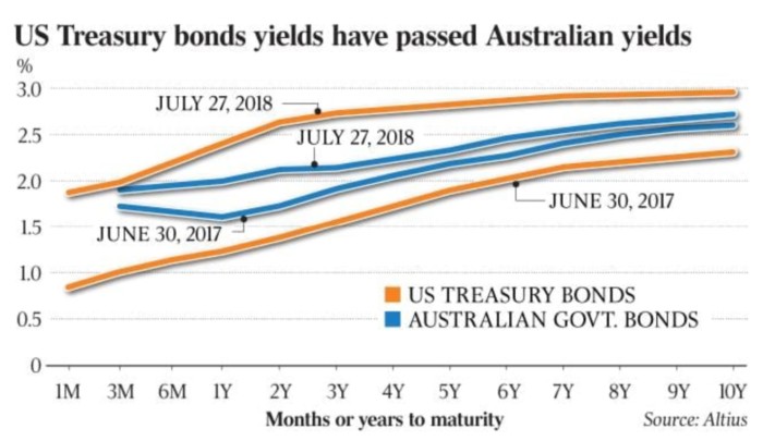 Theo chiến lược gia David Blewellyn-Smith của Quỹ Macro Business, lý do chính của sự rớt giá này nằm ở khác biệt lãi suất giữa Mỹ và Úc. Cục Dự trữ Liên bang Mỹ (Fed) tháng trước đã tăng lãi suất chuẩn (lãi suất liên ngân hàng) lần thứ ba trong năm nay thêm một phần tư điểm phần trăm lên mức 2,25%. Fed cũng dự kiến một lần tăng khác trong tháng 12, thêm ba lần nữa vào năm sau và một lần vào năm 2020.